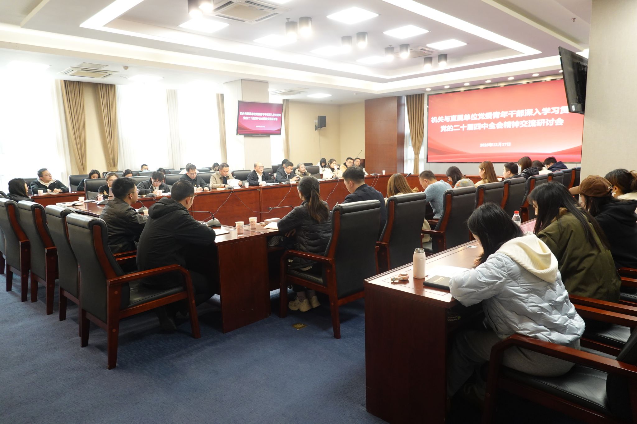 为深入学习贯彻党的二十届四中全会精神,推动机关青年理论提升工程走深走实,机关与直属单位党委于12月17日举办青年干部深入学习贯彻党的二十届四中全会精神交流研讨会。机关与直属单位党委书记何刚出席并讲话,会议由机关与直属单位党委副书记、纪委书记曾双宝主持。机关青年理论学习小组全体成员、各党支部党员发展对象及入党积极分子参加了本次研讨。